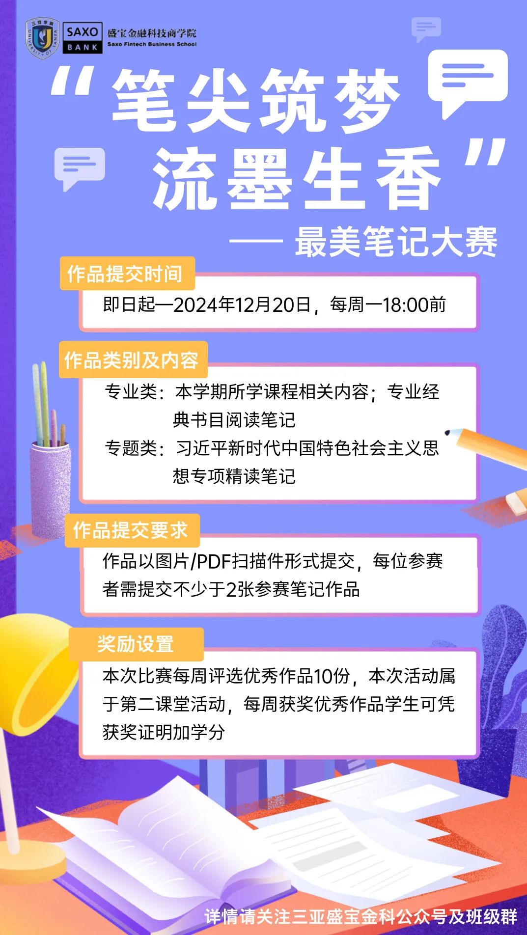 (2)本次比赛采取线上评选的形式,参赛者需每周一18:00前将参赛作品提交至各班学委,投稿作品标题为“笔尖筑梦,流墨生香----最美笔记大赛参赛作品投稿”,作品命名格式为“作品类型+班级+专业+作者姓名+学号”。