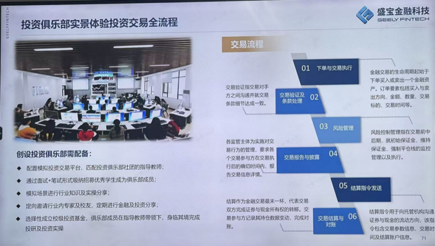 此次访企中,盛宝金融科技公司负责人及相关工程师向老师们分享了企业在金融科技方面正在进行尝试的各种创新型工具,详细讲解了如何将企业需求融入到与高校课堂中,如何将实践内容与课本知识相结合,如何提升员工的实践能力与未来进入企业后的适应能力。工程师还给教师们展示了金融仿真实验室+AI大数据结合的金融模型大平台,也展示了如何利用平台进行投资交易的全流程。