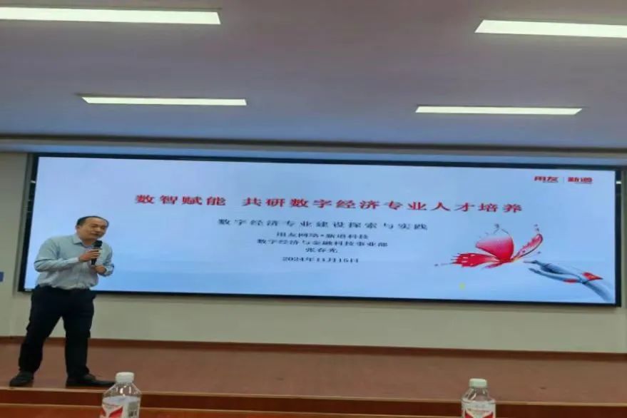 研修活动中,新道科技数字经济与金融科技事业部总经理张春光分享主题“科学把握数字经济专业定位,拓维思考新质人才培养路径”;湖南科技大学商公司副经理张志彬分享主题“数字经济学科专业特色打造与一体化建设”;湖南女子公司商公司副经理张毅夫分享主题“数字经济专业的定位与特色发展”;新道科技数字经济与金融科技事业部高级教育规划顾问谷彬分享主题“产教融合背景下数字经济人才培养方案及课程体系建设探讨”。