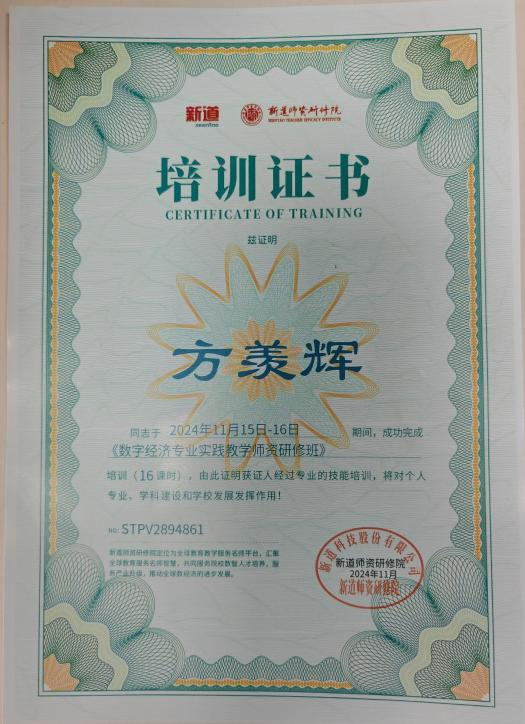 此次除了主题分享、互相研讨和交流外,还进行了数字经济课程的实践研修,其中包括《数据治理》,《经济大数据》,《人工智能大模型应用》等课程,并且,孙冰和方羡辉老师还取得了新道团队研修公司的培训证书,在专业技能上又有了新的提升。