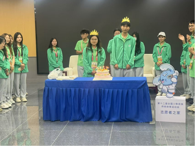 在民族武术志愿服务的征程中,这一瞬尤为温暖。志愿者们暂歇脚步,为同伴庆生。此刻的生日会,是紧张节奏中的舒缓音符,见证了这段时间在团队情谊里的深厚积淀,凝聚着青春、奉献与无尽的美好期许。