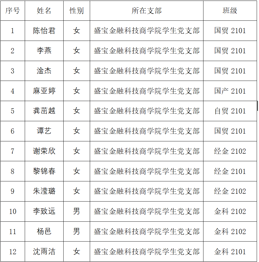 经党组织一年来的培养教育和考察,预备党员陈怡君等同志预备期满,拟在近期召开党员大会分别讨论他们的转正问题。为了进一步增强发展党员工作的透明度,严格组织发展工作程序,防止不正之风,确保发展新党员的质量,现将预备期满的预备党员名单公示如下: