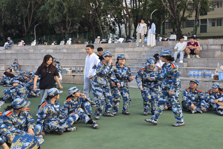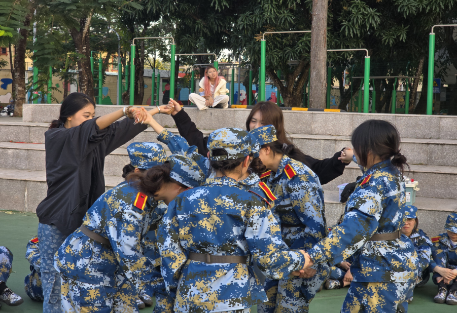 在“蜈蚣翻身”项目中,同学们分成小组,肩并肩站成一排,手拉手形成一条“大蜈蚣”。他们需在保持手拉手的状态下,通过团队协作完成“翻身”动作。队伍的第一个人从尾部开始,依次穿过每个队友的两手之间,直至到达队伍前端,成为新的领头人。这个游戏不仅富有挑战性,更能够增强大一新生的团队意识。