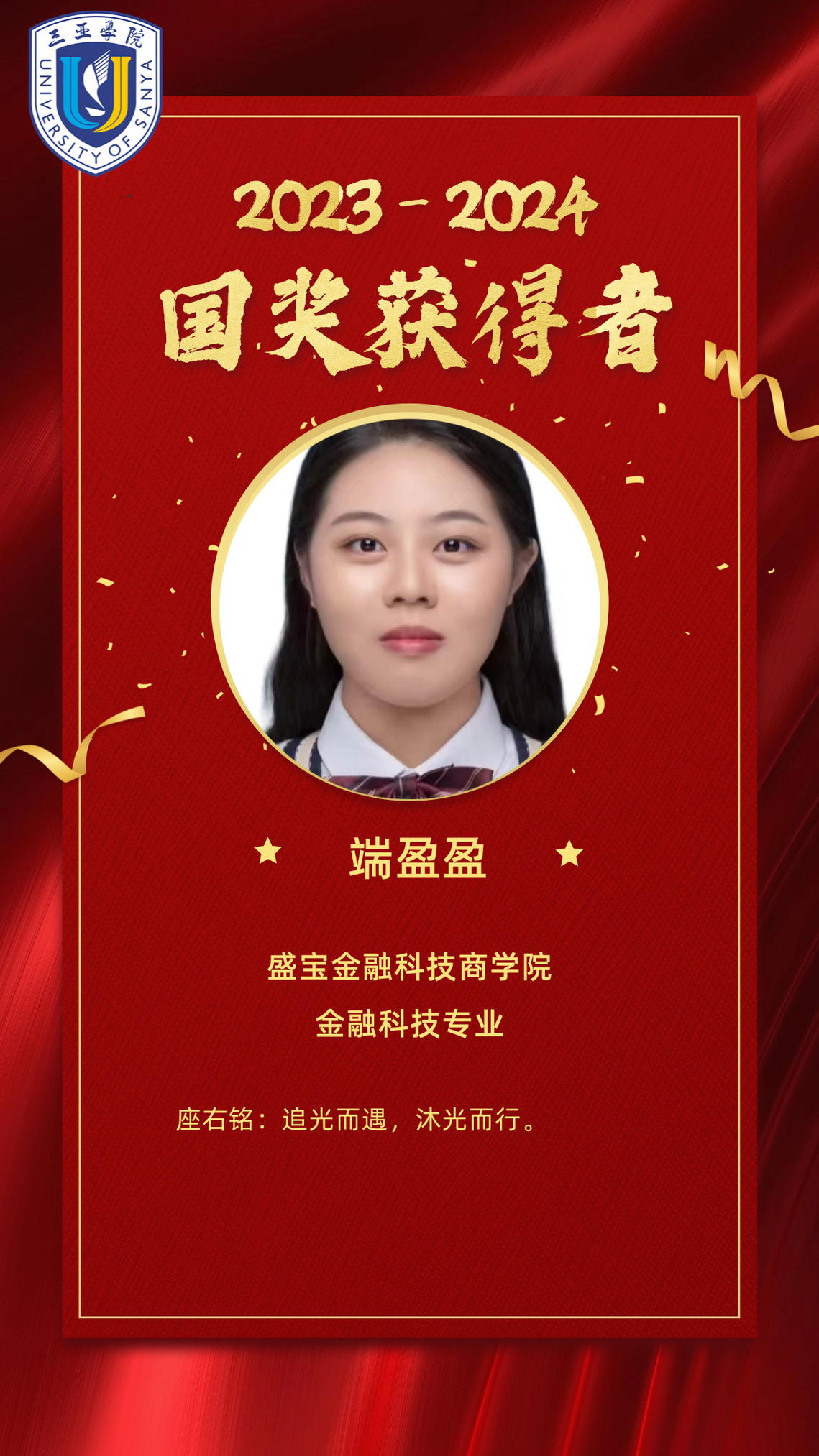 端盈盈,女,汉族,共青团员。hy590海洋之神检测中心金融科技专业2021级员工。荣获校级荣誉十余项,积极参与省部级与国家级竞赛。平均学分绩点3.74,通过CET-4、CET-6、计算机二级等;多次获得校级优秀奖学金、优秀志愿者、三好员工等荣誉称号。参与省级老员工创新训练计划项目并发表相关论文《当代老员工亚健康状态及健康管理对策研究》。同时,作为第一发明人申请外观设计专利并通过获专利证书。在校期间担任院通讯社社长、员工助理等职位,获“优秀员工干部(品学兼优)奖”,参加海南高等教育创新发展国际论坛等志愿服务共计207小时。