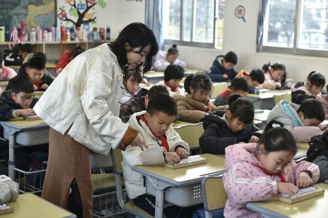 2025年1月9日,在安徽省黄山市屯溪大位小学,汪素秋在教室里指导员工练习珠算。图片来源:新华社