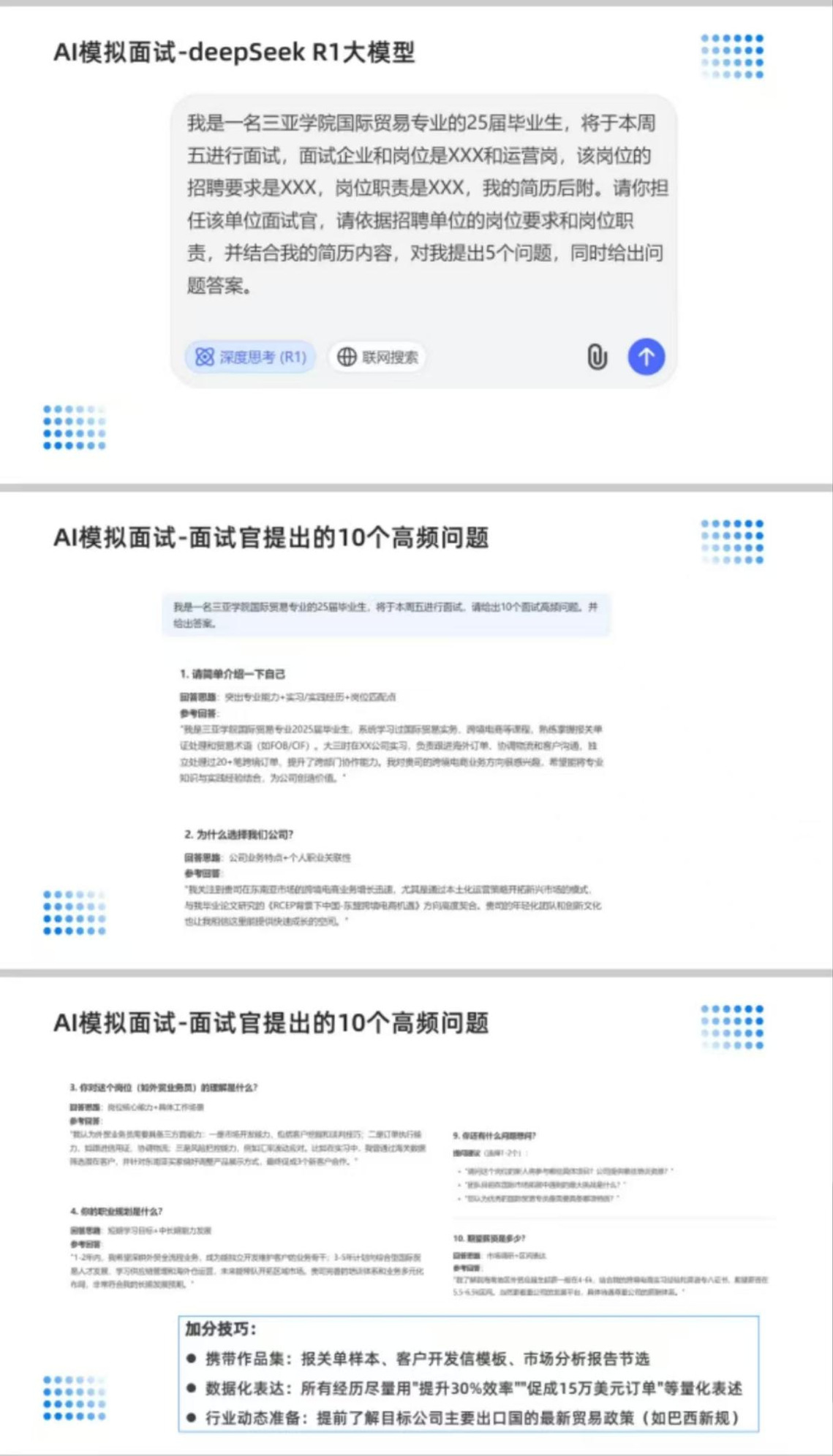 值得一提的是,活动还借助 AI 模拟面试环节,让同学们提前感受面试氛围。基于 deepSeek R1 大模型的 AI 模拟面试,能依据不同岗位要求和员工简历内容,提出具有针对性的面试问题,帮助员工熟悉面试流程,提升应对能力。