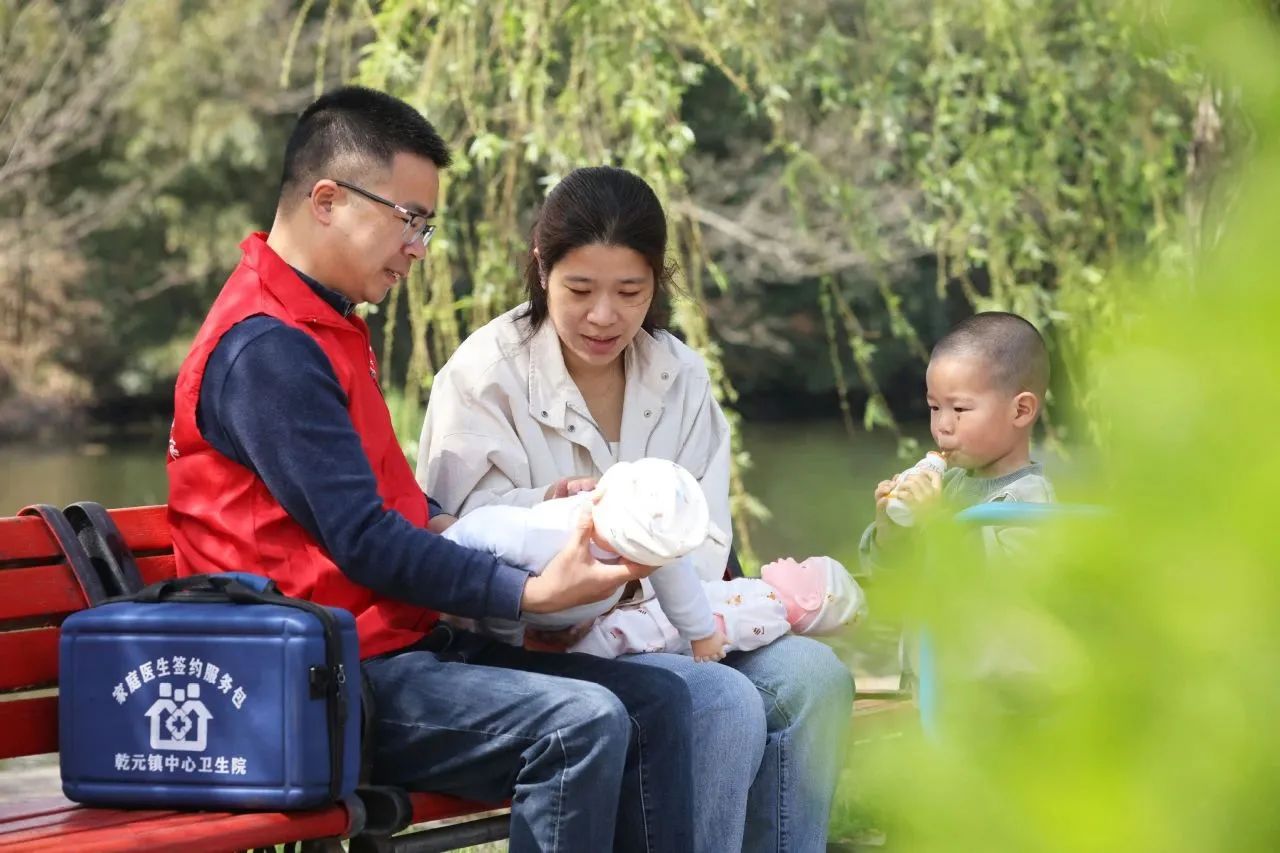 2025年4月7日,浙江省湖州市德清县乾元镇中心卫生院家庭医生、浙江省基层名中医王红武(左)在联星中心村体育休闲公园,指导宝妈进行婴幼儿中医推拿按摩保健。(图片来源:新华社)